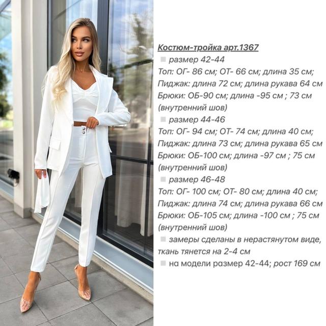 Блакитний модний стильний жіночий костюм-трійка (штани + топ + піджак) з костюмної тканини