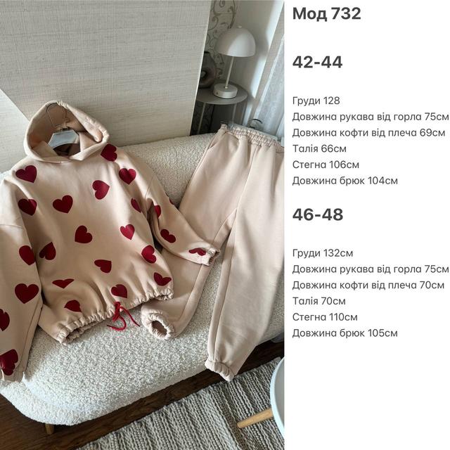 Теплий спортивний костюм-двійка з дорогої тринитки пеньє на флісі молочного відтінку в червоні сердечка