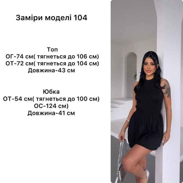 Затишний однотонний жіночий легкий в'язаний комплект із двох частин: кроп-топ та плісирована міні-спідниця.