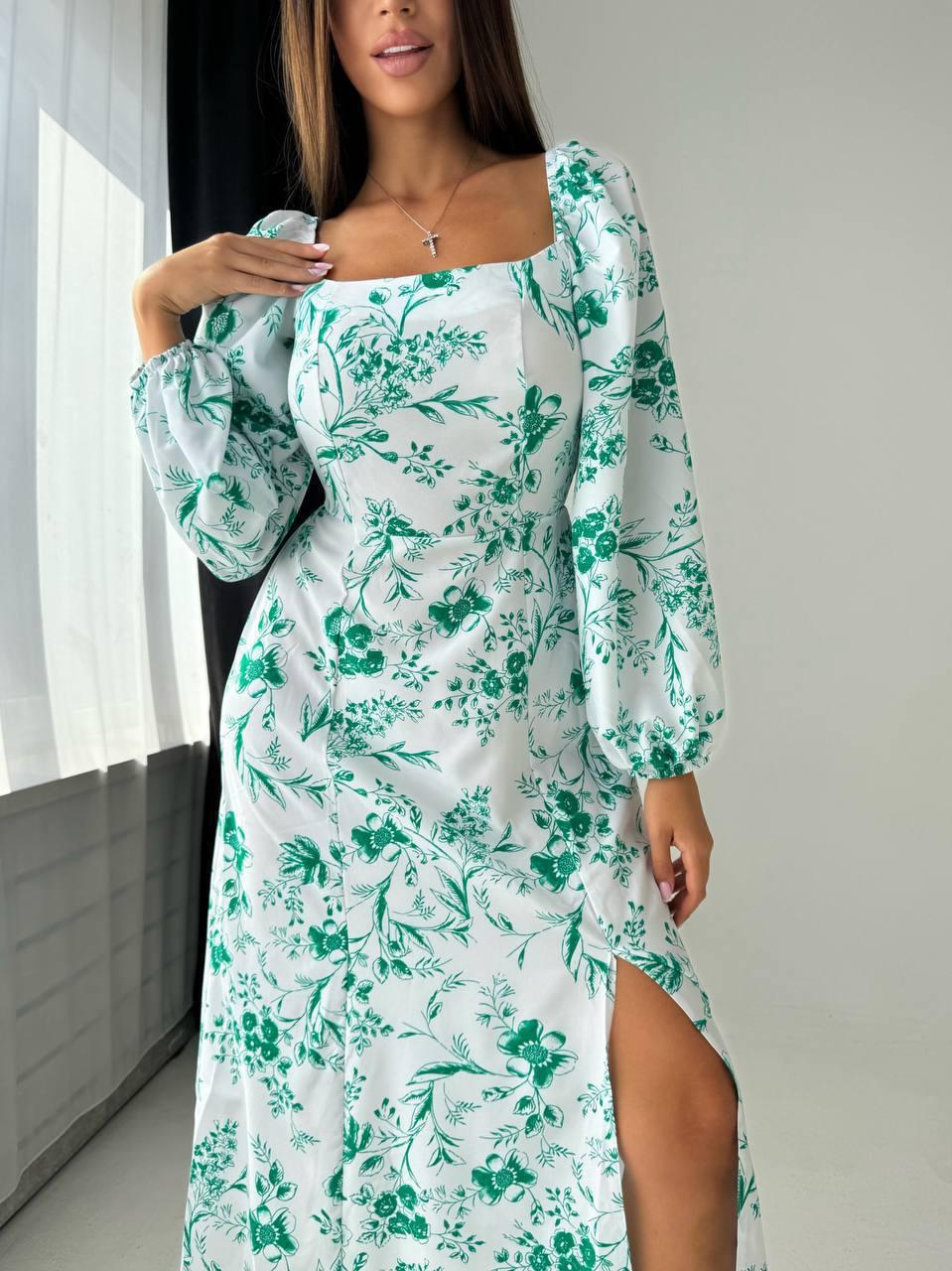 Біла ніжна і легка жіноча романтична приталена сукня міді з софту з розрізом по нозі Квітковий Принт