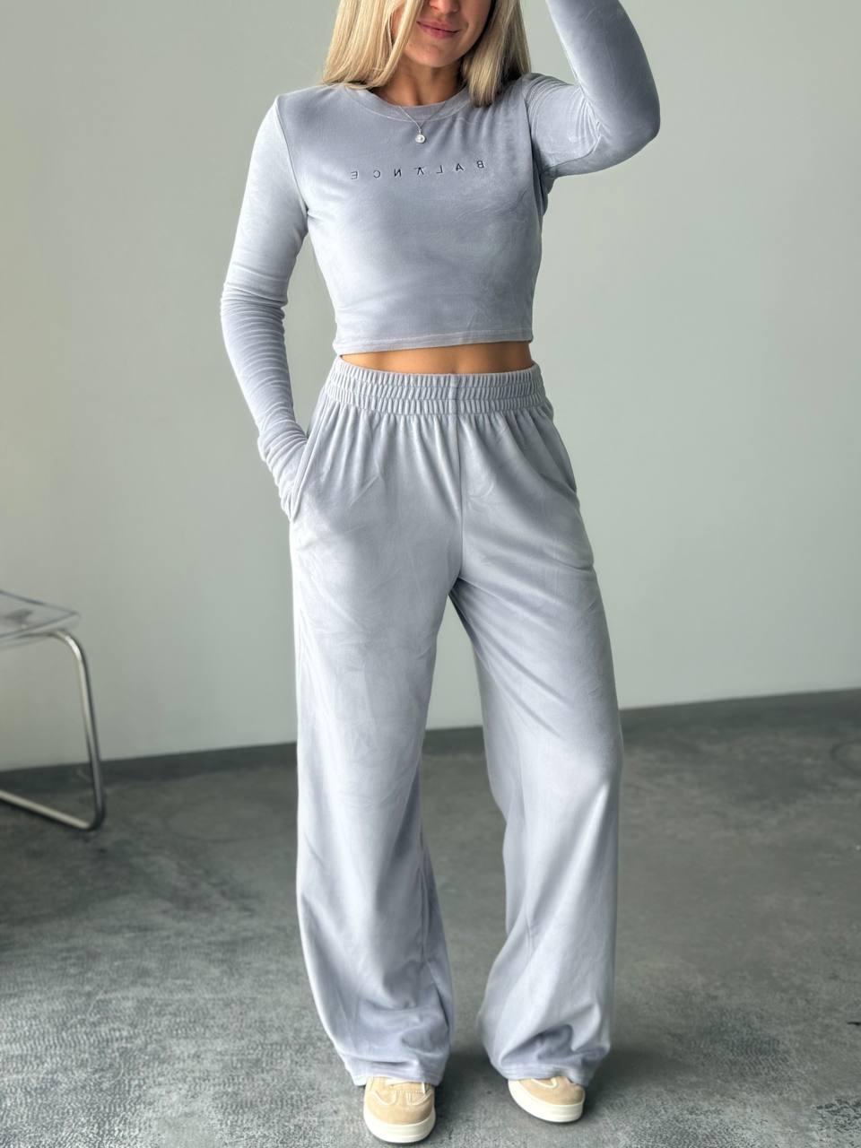 Графітовий стильний жіночий повсякденний велюровий костюм 2-ка: Широкі Штани і вкорочений Топ з вишивкою